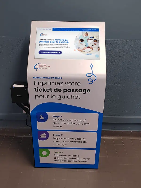 Pour un hôpital, les bornes tactiles PMR ERGO ou MOBILITY est spécialement conçue pour répondre aux besoins des établissements de santé. Disponible en tailles 32, 43 et 49 pouces, elle offre une interface simple et intuitive, adaptée à tous les publics, y compris les personnes à mobilité réduite. Son architecture ergonomique permet une utilisation confortable également depuis un fauteuil roulant. Elle est idéale pour l’orientation des patients, la gestion des files d’attente et la diffusion d’informations sanitaires.