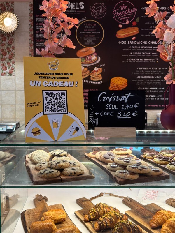 Vos visiteurs scannent un QR code affiché sur un support personnalisé, accèdent à un mini-jeu (Roue de la Fortune, Bandit Manchot, Carte à Gratter), réalisent une action (laisser un avis, s’abonner à vos réseaux sociaux, partager leurs coordonnées) puis participent au tirage au sort pour tenter de gagner un cadeau.