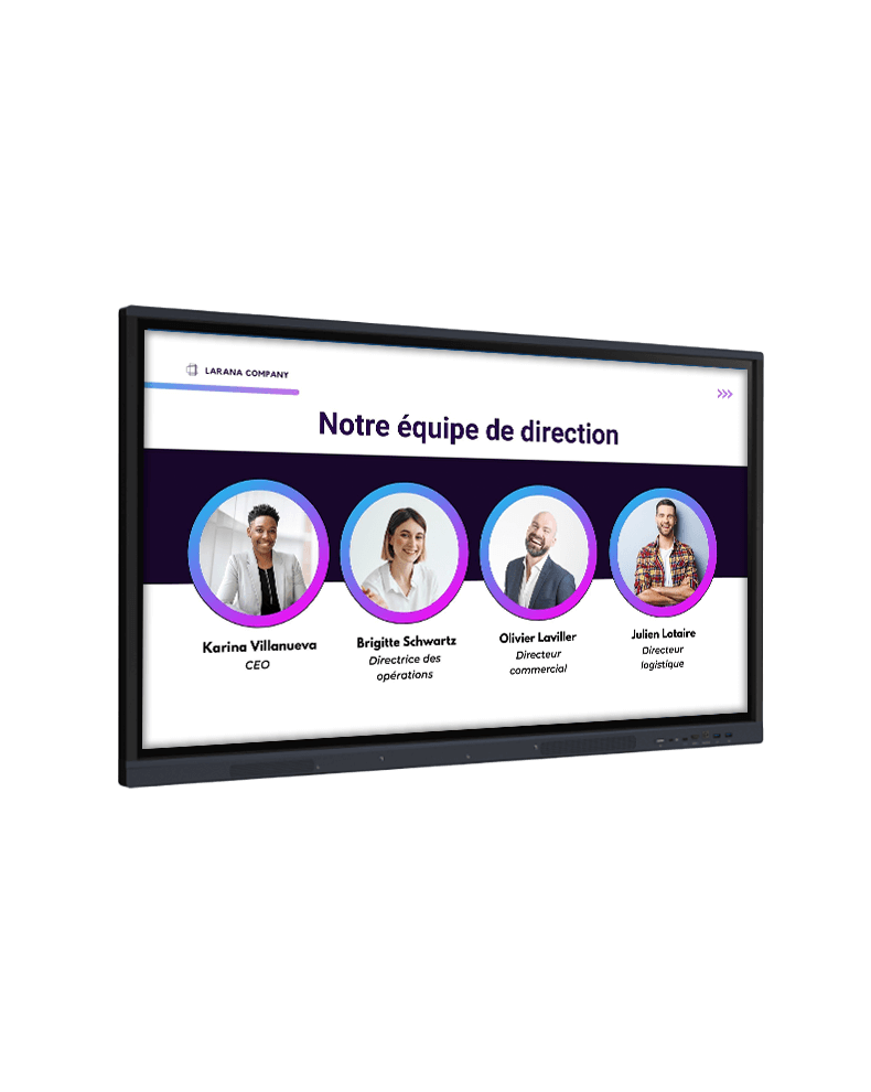 Modernisez vos “Boardrooms” et facilitez le management hybride. Nos écrans tactiles renforcent votre marque employeur en offrant aux collaborateurs des outils de pointe pour collaborer efficacement, que ce soit pour des points d’équipe rapides ou des présentations stratégiques à distance.