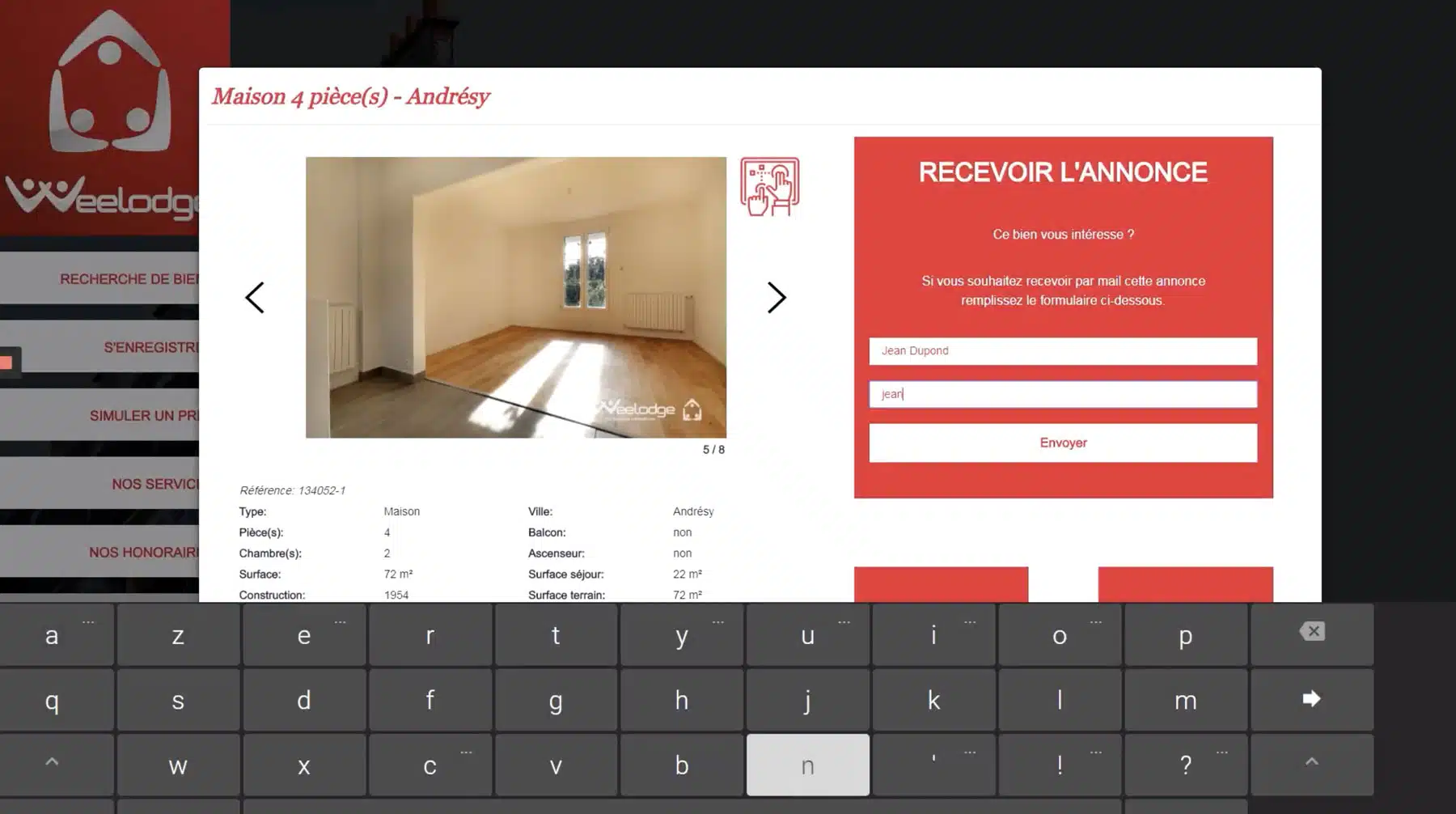 Notre application se greffe à votre base de données, les logements disponibles se mettent ainsi à jour de façon automatique. L’interface de notre application tactile IMMOSEARCH peut de plus intégrer des contenus existants de votre choix à valoriser (visite virtuelle de votre agence, listing des services, témoignages clients, etc).