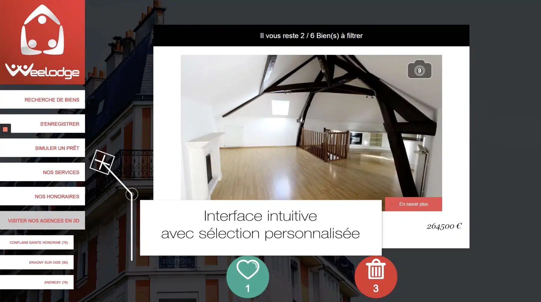 L’interface suit les modèles d’application de rencontre à succès. L’utilisateur exprime ses choix pour chaque logement proposé par un simple j’aime / je n’aime pas et affine ainsi sa sélection.
