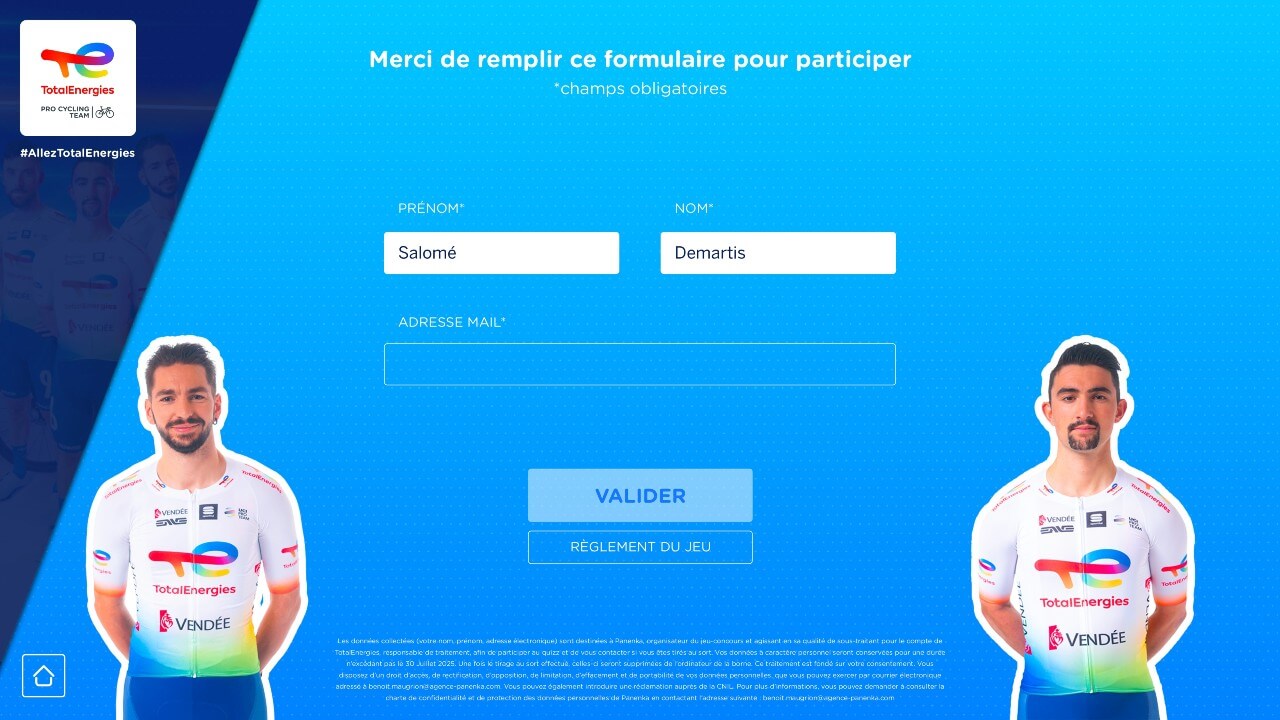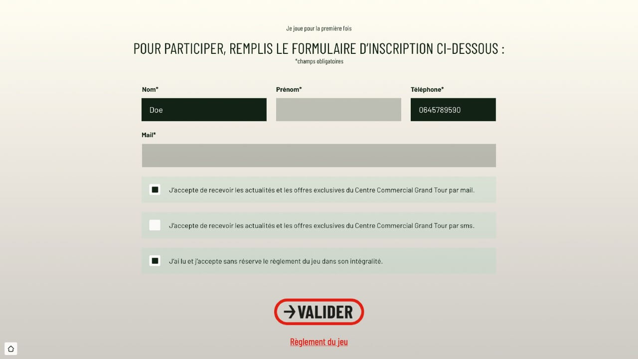 Nos jeux interactifs sont de puissants outils d’acquisition. Intégrez un formulaire de participation directement dans l’expérience pour collecter les informations essentielles de vos prospects (nom, email, téléphone, entreprise…).