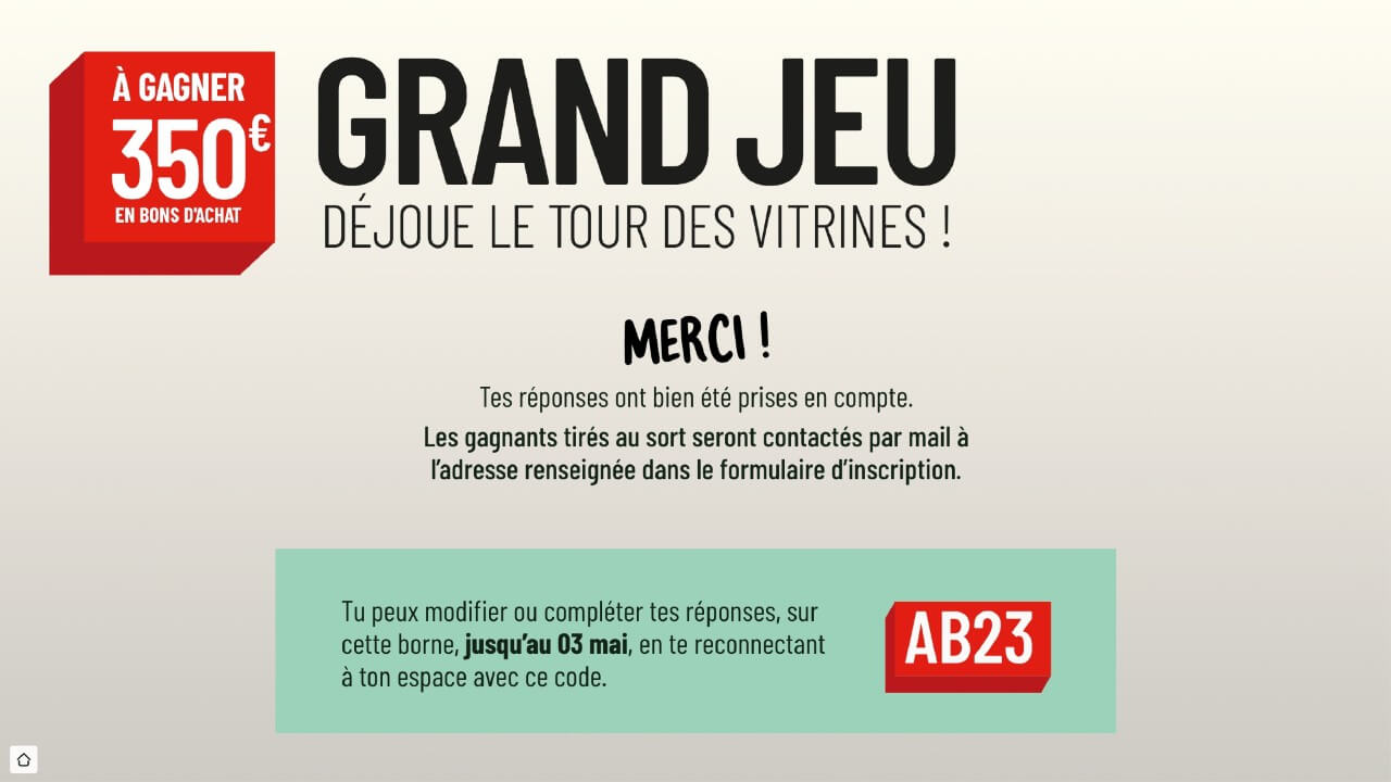 Un jeu interactif crée instantanément du trafic et de la curiosité autour de votre espace. La mécanique ludique (quiz, roue, bandit manchot, …) incite les visiteurs à s’arrêter, participer et partager leur expérience. C’est une manière efficace de valoriser votre marque tout en augmentant la durée de présence des visiteurs sur votre stand ou votre boutique. Cette interaction renforce l’engagement et transforme chaque participant en ambassadeur potentiel.