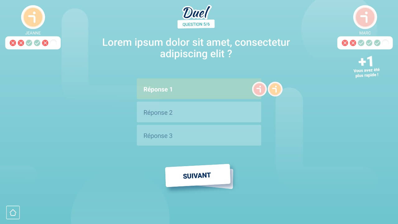 Le style du jeu est également adapté au profil de vos participants. Pour un public jeune, nous privilégions des univers colorés, des mascottes et des effets sonores ludiques. Pour les adolescents, nous concevons des interfaces dynamiques avec des challenges rapides. Les adultes bénéficient d’un design plus épuré, avec des transitions sobres et une mise en avant du contenu.