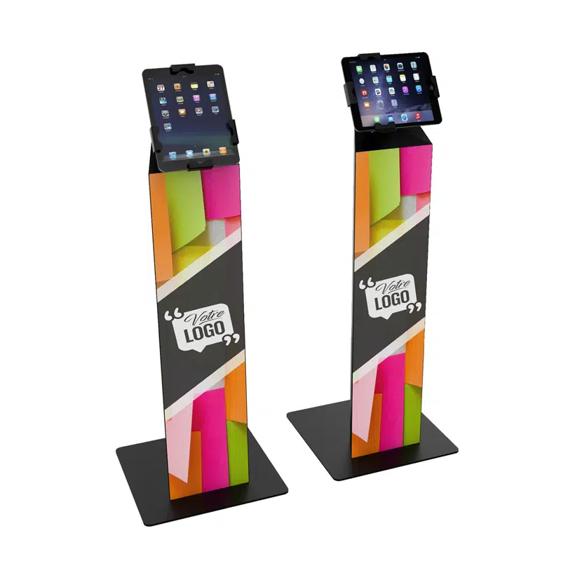 Chez DIGILOR, certains de nos supports sont personnalisables : les modèles “borne tablette PREMIUM”, “borne iPad personnalisable COLUMN” et “borne tablette iPad UNIVERSEL”. Ils disposent en effet d’un pied avec armature sur lequel vous pouvez coller ou aimanter le sticker de votre choix. L’avantage du sticker aimanté est qu’il se pose et se retire facilement sur les quatre faces de la borne tactile, et ce, autant de fois que vous le souhaitez. Le support de votre tablette tactile pourra ainsi être personnalisé et adapté en fonction de vos besoins. Nous vous proposons également des modèles de support de tablette en plusieurs coloris. Les supports DIGILOR se fondent parfaitement dans vos décors !