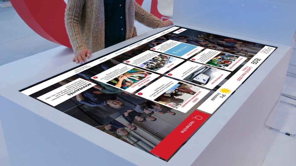 - L’amélioration de l’expérience utilisateur. La table basse tactile offre une expérience interactive unique pour les utilisateurs. Ils s’asseyent autour de la table (ou restent debout si la table est configurée pour être haute) et découvrent facilement les contenus qu’elle propose. La navigation est aussi fluide que sur une tablette tactile. Seul ou en groupe, les utilisateurs naviguent sur les applications disponibles ou jouent à des jeux. Ce dispositif favorise ainsi l’échange et la collaboration entre les participants, ainsi que la créativité.