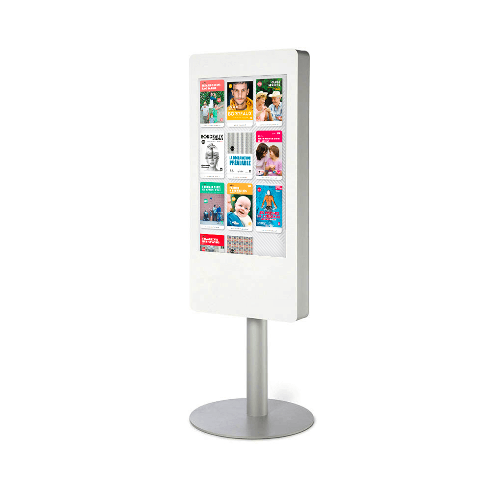 Le design de ce totem interactif 40 pouces iSMART lui permet de s’intégrer facilement à tout environnement. Sur pied, il attire rapidement l’oeil du visiteur et joue un rôle de présentoir amélioré avec lequel il est possible d’interagir. C’est un des totems qui bénéficie d’un succès grandissant et que l’on retrouve dans des endroits très diversifiés : lieux publics pour de la localisation, centres commerciaux pour de la démonstration et présentation de produits, universités pour de l’accueil, stades pour des jeux et concours, etc.